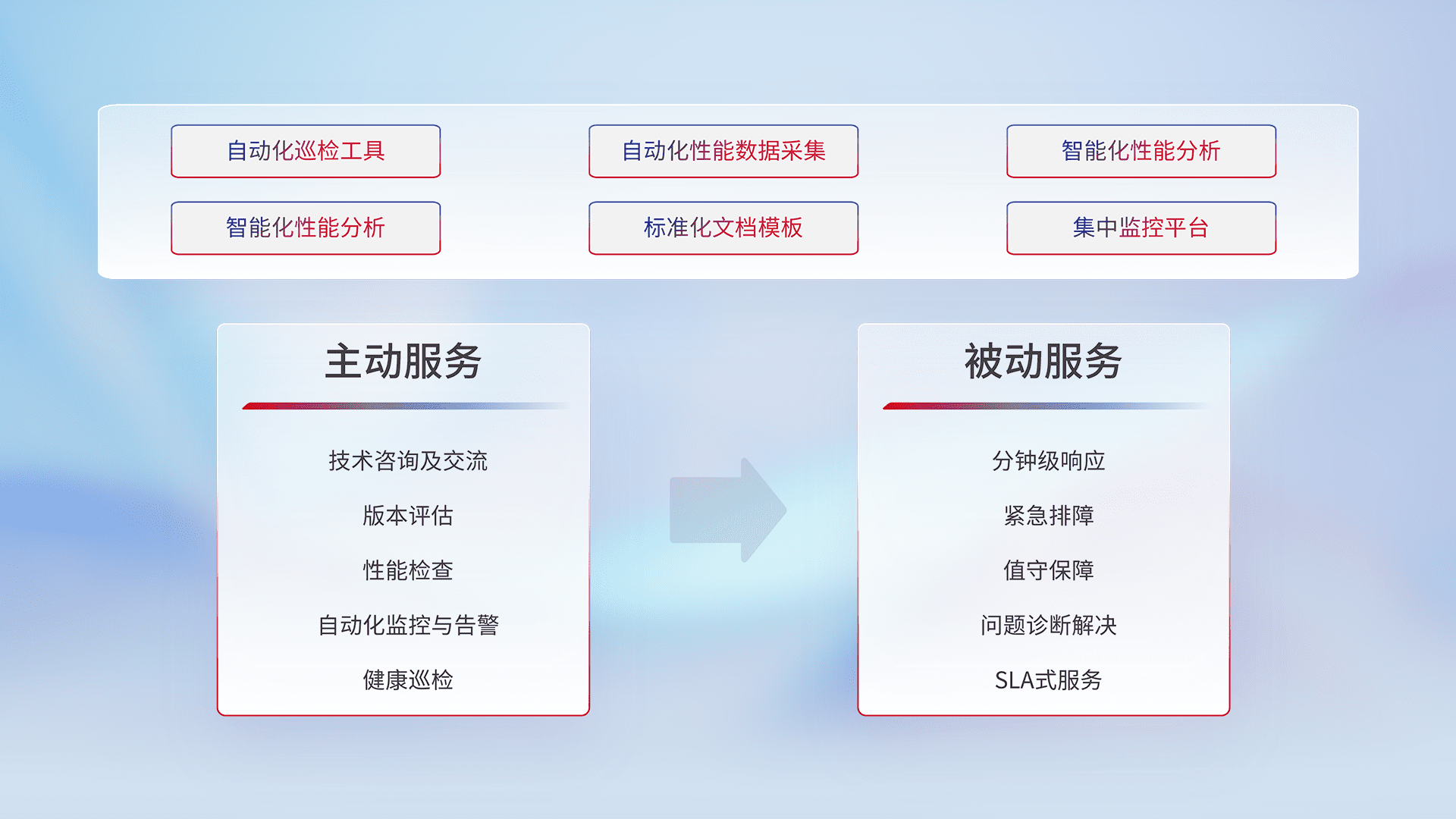 智能化工具和标准化文档,,,保障服务质量,,,提供主动服务(包含技术咨询、、、、版本评估、、、、性能检查、、、自动化监控与告警、、健康巡检)和被动服务包含(分钟级响应、、、、紧急排障、、值守保障、、、、问题诊断解决、、、、SLA服务)。。。。