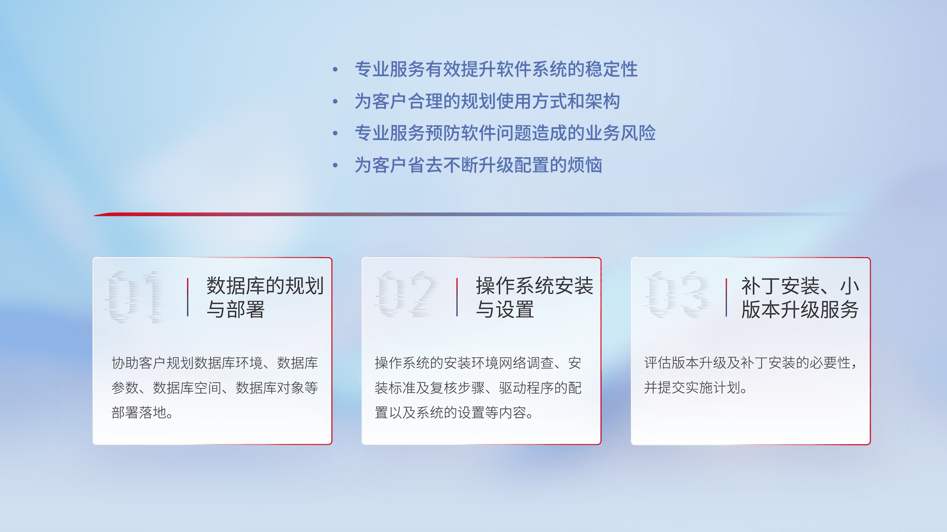 为客户提供软件规模升级、、、快速部署、、按需配置的专业服务,,,,从数据库的规划与部署到操作系统的安装与设置,,,,再到补丁安装和小版本升级提供支持。。